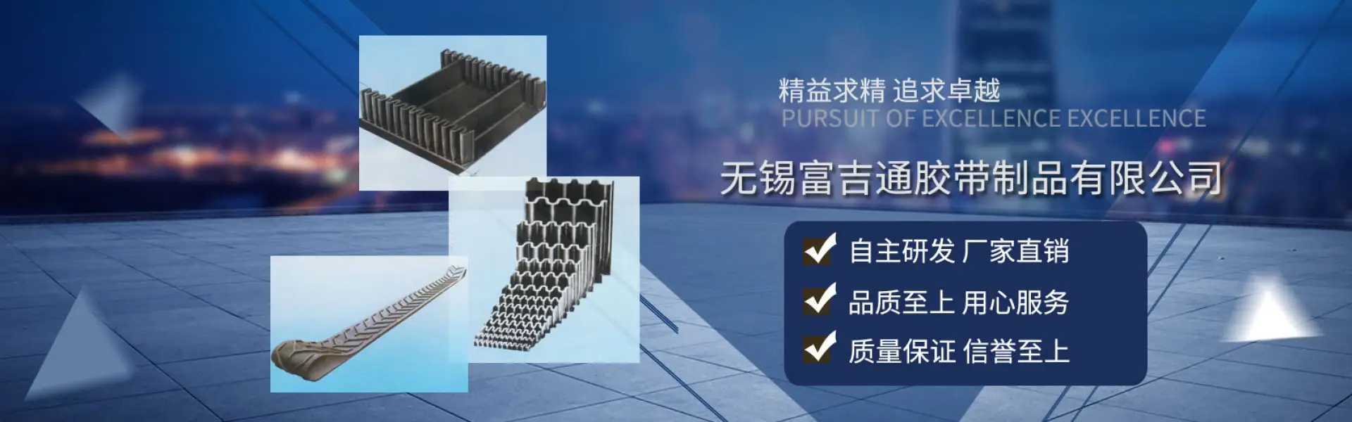 无锡富吉通胶带制品有限公司位于风景秀丽、经济发达的太湖之滨,无锡市江阴祝塘工业园区。公司严格按照现代企业运营机制组建的,主要生产产品为高精度电子皮带秤计量用无接头环型带、裙边带、波型挡边带(大倾角带)、输送带、人字花纹带、聚脂带、耐高温带、轻型尼龙带等橡胶制品。